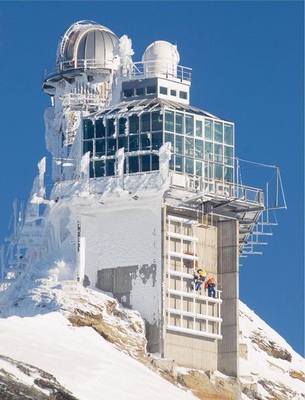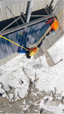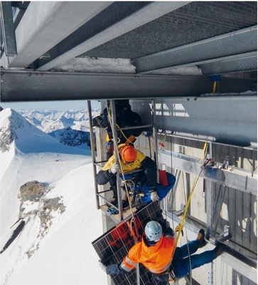 Nach drei Wochen Arbeit sind die zirka 85 Quadratmeter Wandfläche mit 12 Kilowatt Leistung fertig installiert und warten auf die Sonne. Die Strahlung ist stärker als im Tiefland. „Dadurch entstehen zwar höhere Ströme, was wir in der Auslegung berück sichtigen mussten“, sagt Minder, aber auch der Ertrag steigt deshalb im Vergleich zu Anlagen im Tiefland. Dazu tragen auch Schneefelder bei, die zusätzlich Sonnenlicht auf die Zellen reflektieren, und vor allem die Kälte: Der Wirkungsgrad steigt mit fallenden Temperaturen. Was möglich ist, zeigt eine Forschungsstation der Fachhochschule Bern auf dem Joch. Ihre Ergebnisse lassen erwarten, dass die neue Anlage 70 Prozent mehr Ertrag bringt als vergleichbare in tieferen Lagen.