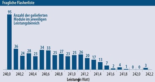 Franz Stangl von der Firma Ambivolt hat den Verdacht, dass ein Modulhersteller die Flasherliste zu einer Lieferung von 470 Modulen manipuliert hat. Die Modulleistungen häufen sich laut Flasherliste am unteren Ende des bestellten Leistungstoleranzfensters (siehe Grafik). Das kann nach Ansicht des Lesers nicht an der Sortierung liegen, da die Module fortlaufende einlaminierte Seriennummern haben. Er fragt, ob sein Verdacht berechtigt ist.