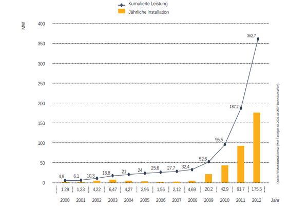 Kleine Korrekturen am Ökostromgesetz (ÖSG) ermöglichten zumindest die Nutzung der vorhandenen Mittel. Bis 2012 kam es jährlich annähernd zu einer Verdoppelung der Ausbaumenge (siehe Grafik). Im laufenden Jahr geht man von über 200 Megawatt aus. Durch die Novelle des ÖSG von 2012 ist ein kontinuierlicher Ausbau in den nächsten Jahren abgesichert. In Österreich gab es nie eine Renditendiskussion sondern die Eigenversorgung stand im Vordergrund. Der Bundesverband Photovoltaic Austria (PVA) strebt einen Stromanteil von acht Prozent für das Jahr 2020 an. Das erste Gigawatt an Leistung soll 2015 erreicht werden.