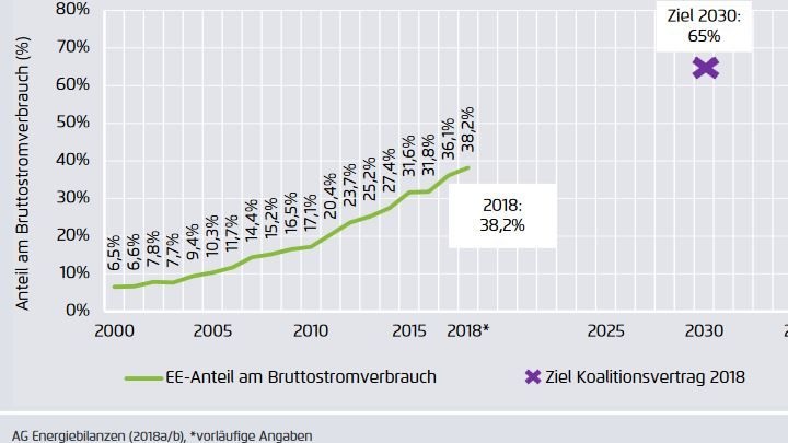 Im Jahr 2018 haben Verbraucher in Deutschland erstmals genauso viel Strom aus erneuerbaren Energien wie aus Kohle bezogen: Jeweils 35,2 Prozent der Stromerzeugung entfielen auf Wind, Sonne und Co. sowie auf Stein- und Braunkohle gemeinsam. Der Anteil der Erneuerbaren am Stromverbrauch betrug sogar 38,2 Prozent. Die Differenz zur Erzeugung erklärt sich durch Stromexporte, die zwar leicht zurückgingen, aber mit über 50 Terawattstunden nach wie vor hoch sind, erklärt die Denkfabrik Agora Energiewende.