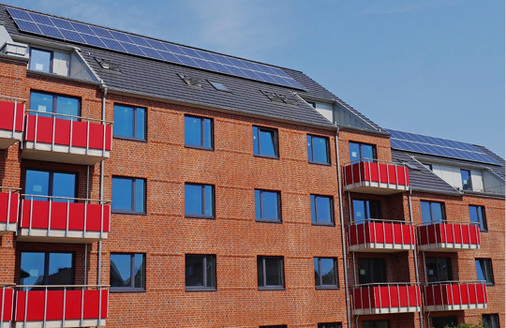 Mehr als ein Mieterstromprojekt hat die Cottbuser Wohnungsbaugenossenschaft eG Wohnen umgesetzt. Sie bietet den Bewohnern von zwei Mehrfamilienhäusern eine Pauschalmiete inklusive der kompletten Energieversorgung an. Den größten Teil des Stroms liefern Photovoltaikanlagen auf den steilen Dächern und an den Fassaden der Häuser.
