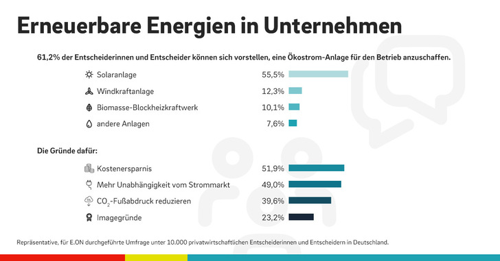 Die Umfrage wurde im Auftrag von Eon unter 10.000 Entscheidern in Deutschland durchgeführt. Als wichtigste Gründe nennen die Befragten Kostenersparnis (51,9 Prozent) und mehr Unabhängigkeit vom Strommarkt (49 Prozent) sowie den Wunsch, den CO2-Fußabdruck zu reduzieren und das Klima zu schützen (39,6 Prozent). Dahinter folgen Imagegründe (23,2 Prozent).