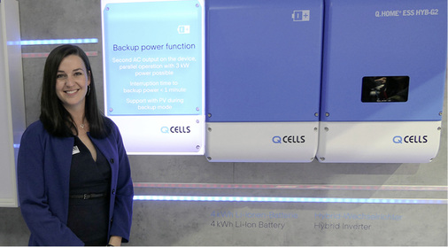 Anfang des Jahres hat Q-Cells einen skalierbaren Speicher für Hauseigentümer und Kleinunternehmen mit hybridem Wechselrichter auf den Markt gebracht. Er heißt Q-Home ESS HYB-G2 und liefert ab vier und bis zu 20 Kilowattstunden. Im Foto präsentiert Teamleiterin Madlen Apel die neuen Systeme.