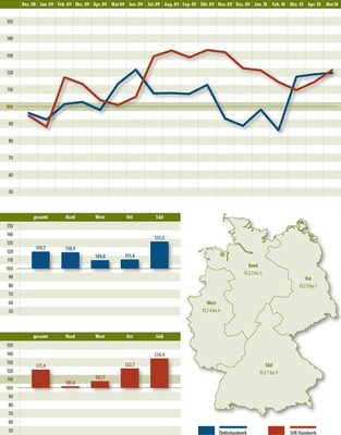 Bei den Elektrikern haben die Optimisten nicht nur bundesweit ihre Mehrheit verteidigt, sondern auch in allen vier Regionen. Auch ihre Kollegen der Bran che Sanitär, Heizung, Klima sind bundesweit überwiegend optimistisch, selbst im bislang zögerlichen Osten stemmte sich der Wert über die 100-Punkte-Schwelle. Allerdings sind bei beiden befragten Gruppen die Kollegen im Norden der Republik nicht mehr ganz so positiv gestimmt wie noch einen Monat zuvor.