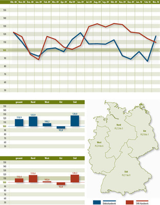 Bei den Elektrikern drehte sich das Bild komplett: Die Optimisten haben nicht nur bundesweit eine deutliche Mehrheit zurückerobert, sondern auch in drei von vier Regionen. Lediglich im Osten liegt die Laune der Elektrohandwerker noch unter der magischen Grenze von 100.