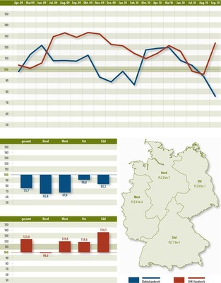 Bei den Elektrikern dominieren die Pessimisten bundesweit und in allen vier Regionen klar das Stimmungsbild – selbst im Norden und im Westen, wo im letzten Monat noch die Optimisten die Fahne hochhielten, sind die Umfragewerte deutlich unter die 100-Punkte-Linie gerutscht. Bei den Kollegen der Branche Sanitär, Heizung, Klima hingegen hat sich die schon bei der letzten Befragung gute Stimmung noch weiter verbessert – bundesweit ebenso wie im Westen, Süden und Osten. Lediglich im Norden ist die Laune eher gedrückt.