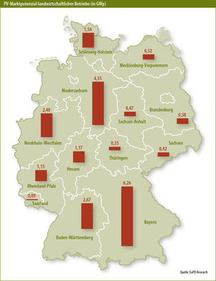 Spitzenreiter ist wiederum mit Abstand Bayern mit 6,26 Gigawatt, dahinter folgen Baden-Württemberg, Niedersachsen und Schleswig-Holstein. Für die gesamte Bundesrepublik errechneten die Bonner Marktforscher ein Potenzial von 22,27 Gigawatt Photovoltaikleistung auf Dachflächen von landwirtschaftlichen Gebäuden. „Wir konzentrierten uns auf Aufdachanlagen, weil Landwirte wegen der weniger attraktiven Einspeisetarife und der vorhandenen Dachgrößen kaum Freiflächenanlagen bauen“, erklärt Studienautor Christian Schossig.