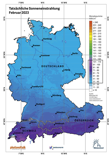 Im Internet finden Sie den aktuellen Einstrahlungsatlas des gerade abgelaufenen Monats als PDF-Datei zum Download. Außerdem hat unser Partner Meteotest aus Bern für Sie eine interaktive Karte programmiert. Darin finden Sie für jeden Standort in Deutschland, Österreich und der Schweiz die Einstrahlungsdaten als Datensatz, ebenso eine Zeitreihe zurückliegender Monate. Gehen Sie einfach mit Ihrer Abokennung auf unsere Website. Den Service finden Sie im Webartikel 1263.