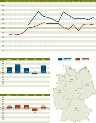 Überraschung: Insgesamt gibt es bei Heizung, Klima & Sanitär diesmal sogar mehr Betriebe, die ihre Stimmung positiv bewerten, als bei den Elektrikern. Nur im Norden schunkeln die Strom-Experten in ausgelassener Stimmung. Zwei Drittel der Branche sind hier, was ihre Photovoltaikgeschäfte betrifft, guter Dinge. Und im Osten gibt’s nichts Neues: Für Elektriker und Klempner geht’s hier weiter bergab.