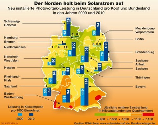 Im Vergleich der Bundesländer zeigt sich, dass der Norden gegenüber dem Süden Deutschlands kräftig aufgeholt hat. „Dieser Trend widerlegt das Klischee, Solaranlagen würden sich nur in Süddeutschland lohnen. Eine gute Entwicklung, weil damit auch eine gleichmäßigere Netzauslastung im Bundesgebiet erreicht wird“, kommentierte Carsten Körnig, Hauptgeschäftsführer des BSW-Solar. Bayern belegt weiterhin den Spitzenplatz beim absoluten Photovoltaik-Zubau. 32,8 Prozent der neu installierten Gesamtleistung sind demnach im Freistaat installiert worden, gefolgt von Baden-Württemberg mit 13,6 Prozent und Nordrhein-Westfalen mit 12,2 Prozent. Allerdings wenn die Neuinstallationen pro Kopf im Ländervergleich betrachtet würden, käme Bayern als Spitzenreiter auf 194 Kilowatt pro 1000 Einwohner, gefolgt von Brandenburg mit 136 Kilowatt und Schleswig-Holstein mit 129 Kilowatt. In dieser Rangliste zieht sogar Mecklenburg-Vorpommern mit 94 Kilowatt mit Baden-Württemberg gleich, wie der Verband errechnete.