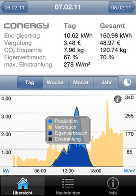 Die Conergy AG hat eine neue iPhone-App für den Eigenverbrauch herausgebracht. Besitzer von Photovoltaik-Anlagen könnten damit ihren selbstverbrauchten Solarstrom weiter optimieren und auch unterwegs kontrollieren, teilte das Hamburger Unternehmen mit. Die Software-Applikation sei ab sofort und kostenlos im Apple App-Store verfügbar. Die App verbinde die wichtigsten Funktionen von VisionBox und SunReader-Portal von Conergy. Kunden könnten damit jederzeit überprüfen, wieviel Solarstrom ihre Photovoltaik-Anlage aktuell und seit der Inbetriebnahme produziert habe. Gleichzeitig könnten Anlagenbesitzer sehen, wieviel Strom im Haushalt verbraucht wird und wie hoch der Eigenverbrauchsanteil ist. Alle Werte werden wahlweise als tabellarische Übersicht oder farbige Grafik in der Applikation angezeigt. Der Nutzer könne dabei zwischen Tages-, Wochen-, Monats- und Jahresansicht wählen. Mit der iPhone-App lasse sich sogar die erwirtschaftete Geldbetrag anzeigen. Dieser ergebe sich aus der Summe der Einspeisevergütung für die Photovoltaik-Anlage sowie den vermiedenen Strombezugskosten. (Sandra Enkhardt)