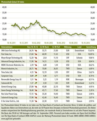Eigentlich ist es Routine: Ende September überprüft die zuständige Royal Bank of Scotland (RBS) in jedem Jahr die Zusammensetzung des Photovoltaik Global 30 und mischt die Aktien bei Bedarf neu – schließlich soll der Index die größten und liquidesten Unternehmenswerte der Branche abbilden. In diesem Jahr war der Anpassungsbedarf groß. 16 der 30 Unternehmen, die noch vor einem Monat den Branchenkorb füllten, haben die Analysten von der Liste gestrichen: die deutschen Unternehmen Centrotherm, Roth & Rau, Phoenix Solar und Q-Cells, außerdem Solaría Energia (Spanien), NPC (Japan), Canadian Solar (Kanada), GT Advanced Technologies und STR Holdings (beide USA) sowie LDK Solar, Yingli, Suntech Power Holdings, JA Solar, Renesola, Jinko Solar und Hanwha Solar One (alle China).