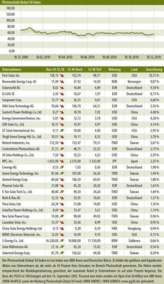 Der Photovoltaik Global 30 gerät in Bewegung, allerdings nicht in die gewünschte Richtung. Am Stichtag 10. Dezember lag der Index bei 55,52 Punkten und damit etwa 5,5 Prozent unter dem Niveau des Vormonats. 21 der 30 Unternehmen des Branchenkorbes mussten fallende Kurse hinnehmen.
