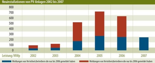 Laut Bundesverband der Energie- und Wasserwirtschaft (BDEW) wurden 2007 rund drei Terawattstunden PV-Strom ins Netz gespeist. Wir haben eine „Rückwärtsrechnung“ angestellt: Wenn Ende 2006 rund 2,7 Gigawatt installiert waren, die etwa 2,22 Terawattstunden PV-Strom ins Netz speisten, lässt sich bei einem mittleren Jahresertrag auf Basis der Datensammlung des SFV und einer angenommenen Einspeisung von 45 Prozent der neu installierten Leistung für 2006 und vorher die jeweilig festgelegte Jahresinstallation nachrechnen. Für 2007 ergibt sich in etwa der gleiche Wert wie für 2006 – also rund 800 bis 850 Megawatt.