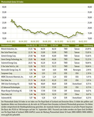 Bei Meyer Burger (-8,8 Prozent), dem vierten europäischen Unternehmen im Photovoltaik Global 30, fiel der Kursverlust vergleichsweise moderat aus. Das haben die Schweizer einem Australier zu verdanken: Der australische Hedgefonds Platinum Asset Management hat Anfang 2013 bei Meyer Burger zügig ein großes Aktienpaket zusammengekauft und ist mit einer Beteiligung von 5,33 Prozent nun größter Aktionär. Hinter Platinum steckt der Milliardär Kerr Neilson, der in der Hedgefonds-Szene gern mit Star-Investor Warren Buffet verglichen wird. Beiden wird ein Gespür dafür attestiert, in Unternehmen zu investieren, die vom Markt vernachlässigt wurden. Buffett war im Januar mit zwei Milliarden US-Dollar in amerikanische Solarprojekte eingestiegen und hatte damit für eine Belebung vieler Photovoltaikwerte gesorgt. Im Fall von Meyer Burger hoffen die Analysten durch den Einstieg von Kerr Neilson jetzt in erster Linie auf eine Kursberuhigung.