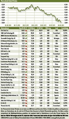 Deutschland ist jetzt nur noch mit sechs Unternehmen im Index vertreten – aus Asien kommen 15. Und Deutschland stellt in diesem Monat mit Solarworld (-30,94 Prozent) auch noch den Indexverlierer. Der Solarmodulhersteller will ein Werk in Kalifornien und eine Produktionslinie in Deutschland schließen und steht Analysten zufolge unter einem massiven Margendruck. Dass Solarworld 2011 von einer Jahresendrallye bei der Nachfrage ausgeht und die Zahlen zum zweiten Quartal besser als erwartet ausgefallen sind, lässt die Experten kalt: Sie rechnen nicht mit einer durchgreifenden Erholung der Preise angesichts eines Umfeldes, das unter anderem von zu hohen Kapazitäten in der Branche geprägt ist.