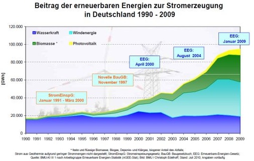 Die erneuerbaren Energien trugen 94,8 Terrawattstunden zum deutschen Endenergieverbrauch bei, wie aus der Publikation hervorgeht. Die Photovoltaik-Anlagen in Deutschland erzeugten im vergangenen Jahr 6,578 Terrawattstunden Solarstrom. Immerhin fast ebenbürtig ist die Solarbranche in Sachen Arbeitsplätzen. Ingesamt seien rund 300.500 Menschen in der Erneuerbaren-Energien-Branche im vergangenen Jahr beschäftigt gewesen, so das Bundesumweltministerium. 26,5 Prozent davon entfielen auf den Sektor Solarenergie. Dies entspricht einer Zahl von knapp 80.000 Arbeitsplätzen. Die meisten Menschen waren demnach im Biomasse-Bereich beschäftigt, gefolgt von der Windenergie. Die Investitionen in Erneuerbare-Energien-Anlagen seien in Deutschland ungeachtet der Wirtschaftskrise 2009 auf ein Rekordhoch von mehr als 20 Milliarden Euro gestiegen. Die gesamte Wertschöpfung der Erneuerbaren, dies bedeute Investitionen und Betrieb habe 37,5 Milliarden Euro erreicht und somit um fast ein Viertel über dem Vorjahreswert von 30,6 Milliarden Euro gelegen. (Sandra Enkhardt)
