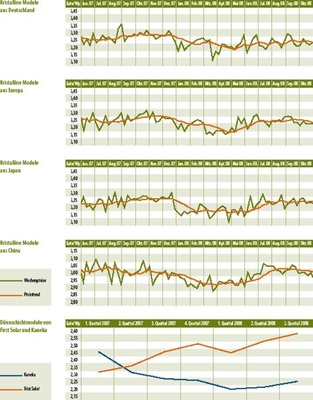 Auf der anderen Seite beeinträchtigt die internationale Bankenkrise auch die Ausbaupläne vieler Hersteller. Daraus ergibt sich ein gebremstes Wachstum, sofern sich die allgemeine Lage an den internationalen Finanzmärkten nicht kurz- bis mittelfristig entspannt. Folglich werden die prognostizierten Überkapazitäten nicht so schnell erreicht, was einem baldigen deutlichen Preisverfall entgegenwirkt – der Markt bleibt also spannend. ?