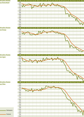 Nicht nur im Spotmarkt haben die Preise im Vergleich zum Vormonat nachgegeben, auch Vertragspreise wurden weltweit im April und Mai – zumindest bei kristallinen Modulen – teilweise deutlich gesenkt. Auf der PV-Messe SNEC in Shanghai, die Ende Mai stattfand, war zu spüren, dass viele chinesische Hersteller trotz wiederholter Preissenkungen wegen nicht ausreichender Lieferaufträge immer weiter unter Druck geraten. Auch in Deutschland gab es in den vergangenen Wochen von bekannten Zell- und Modulherstellern nur wenig Positives zu vermelden. Trotzdem gibt es in diesen schweren Zeiten offenbar auch Gewinner: Firmen wie Yingli und Solarworld bleiben optimistisch, starten Vertriebsoffensiven wie die „solare Dachsparkasse“ oder passen ihre Rahmenverträge den stark gesunkenen Modulpreisen an. Darüber hinaus tragen Produktionskostensenkungen durch den Aufbau noch größerer Kapazitäten dazu bei, der globalen Krise zu trotzen.