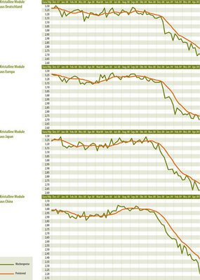 Angesichts des aktuellen Preisniveaus ist es aber unwahrscheinlich, dass es in naher Zukunft noch weiter nach unten geht. Das betrifft insbesondere Hersteller kristalliner Module aus Fernost. Die Gestehungskosten sind momentan gerade noch gedeckt, es können auf dem Markt vielleicht sogar noch geringe Margen erreicht werden, eine zusätzliche Preisminderung jedoch dürfte vielen Firmen große Probleme bereiten.