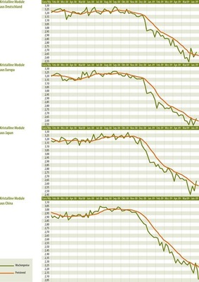 Der Monat Mai brachte neue Preissenkungen in Asien und Europa mit sich. Dennoch gibt es in jeder Region einen Hersteller, dessen Preise auf dem Spotmarkt höher sind als die der meisten anderen Anbieter – Suntech Power in China, Kyocera in Japan, Solon in Europa. Trotz des Preisverfalls seit Anfang des Jahres haben diese Unternehmen aus unterschiedlichen Gründen beschlossen, nicht auf das Preisniveau der Konkurrenz zu gehen.