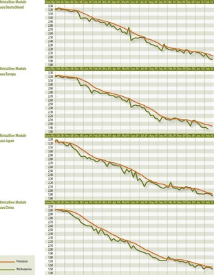 Weltweit haben viele Modulhersteller in den vergangenen Wochen eine Preisreduktion vorgenommen, die sich seit Anfang des Jahres an der Höhe der Absenkung der deutschen Einspeisevergütung zum 1. Januar 2010 orientiert. Kristalline Module aus Asien waren auf dem Spotmarkt im Februar rund fünf Prozent günstiger als im Dezember 2009. Die durchschnittlichen Preise der europäischen Modulhersteller zeigen eine ähnliche Tendenz. Siliziumbasierte Module dürften im Preis zudem weiter fallen, da bis 2012 voraussichtlich die Rohstoffpreise sinken; der Grund ist ein Überangebot an Solarsilizium.