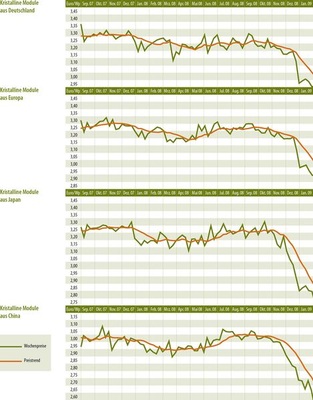 Die Degression in Deutschland wird höchstwahrscheinlich durch Kostensenkungen aufgefangen. Die Preise in Januar lassen darauf schließen: Module aus China sind jetzt im Durchschnitt 0,15 Euro günstiger als im Dezember, japanische Module 0,10 Euro. Deutsche Hersteller bieten jetzt ihre Produkte etwa 0,03 Euro günstiger an als im vorherigen Monat. Es ist möglich, dass die bisher hohen Margen der namhaften Modulhersteller nicht mehr zu erwirtschaften sein werden. Nicht verkaufte Kapazitäten von 2008 und die korrigierten Wachstumsprognosen vieler Unternehmen haben im Januar zu großen Verlusten an der Börse geführt.