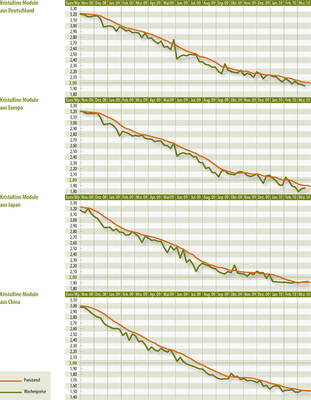 Die Preise der europäischen und deutschen Hersteller sind im Februar und März im Vergleich zur Überseekonkurrenz deutlicher als in den Vormonaten gesunken. Zum ersten Mal konnten deutsche Module durchschnittlich unterhalb der Zwei-Euro-Marke auf dem Spotmarkt erworben werden. Besonders gefragt sind die polykristallinen Produkte von Schott Solar, da diese deutlich unter dieser Preisgrenze liegen.
