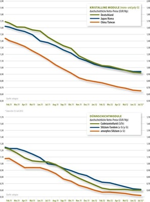 Insgesamt sanken die Preise für kristalline Module, die erneut die Nachfrage auf unserer Plattform dominierten, für den Monat Juni im Durchschnitt um 2,1 bis 4,3 Prozent. Im Gegensatz zum Vormonat verzeichneten kristalline Module aus China den höchsten Preisrückgang. Zum ersten Mal seit Einführung der Preisbarometer-Kategorie „Kristallin Deutschland“ im Januar 2011 lag der entsprechende Durchschnittspreis noch unter dem Wert der Kategorie „Kristallin Japan“. Dies ist auf die Zunahme der Insolvenzen unter deutschen Herstellern zurückzuführen, die ihre Ware nun unter dem bisherigen Marktwert veräußern müssen. Hinzu kommt, dass japanische Hersteller im heimischen Markt bisher nicht mit internationaler Konkurrenz zu kämpfen hatten. Außerdem befinden sie sich dort in einem stabilen Absatzmarkt, der mit der Einführung einer großzügigen Einspeisevergütung noch stärker wachsen wird. Im deutschen Markt hingegen dominieren internationale Hersteller, vor allem aus China. Deren Preise liegen weit unter denen deutscher Hersteller und führen so zu einem zusätzlichen Preisdruck.