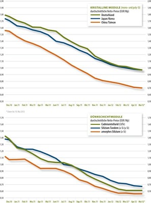 Wie bereits im März verzeichnet der Preisindex auch im April lediglich einen moderaten Rückgang der Modulpreise. Die Durchschnittswerte liegen nun in allen Kategorien unter einem Euro pro Watt. Je nach Abnahmemenge, Hersteller und Effizienz wurden bei kristallinen Modulen aus Deutschland und Japan sogar bereits vereinzelt Preise von unter 90 Cent je Watt verzeichnet. Bei kristallinen Modulen aus China gab es den größten Preisrückgang: Für größere Abnahmemengen waren in dieser Kategorie sogar in manchen Fällen Preise von unter 60 Cent pro Watt möglich.