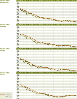 Die Höhe der Solarstromförderung Italiens und der gleichzeitige Mangel an Polysilizium am Spotmarkt haben die Modulpreise nach oben ziehen lassen. Besonders auffällig ist das Verhalten der chinesischen Hersteller, die ihre Preise in den vergangenen drei Monaten kontinuierlich gesteigert haben. Die Polysilizium-Lieferanten möchten kurzfristige Risiken vermeiden und verkaufen den Großteil ihrer Produktion mittels langfristiger Lieferverträge. Lagen vor wenigen Wochen die Spotpreise pro Kilogramm Silizium bei 55 bis 60 US-Dollar, so erreichen diese jetzt Werte von 70 bis 80 US-Dollar. Einen unmittelbaren Effekt auf die Modulpreise hat auch, dass die Menge der Waferhersteller nicht ausreicht, um die Nachfrage der Zellhersteller zu decken. Anfang August teilt beispielsweise der Wafer-, Zellen- und Modulhersteller LDK Solar aus China mit, dass im zweiten Quartal der Verkauf von Wafern etwa 20 Prozent über dem Vorquartal liegt. Zeitgleich steigen die Preise um zwei Cent pro Watt auf 0,85 US-Dollar. Nicht überraschend teilt das Unternehmen zudem mit, dass im gleichen Zeitraum der Verkauf der Solarmodule verdoppelt wurde.