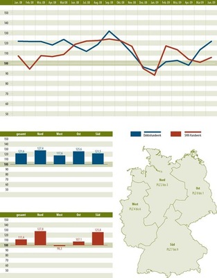 Auch die Erwartungen der Branche an die Zukunft sind überwiegend positiv. Die Elektriker sehen den kommenden drei Monaten hoffnungsvoll entgegen, vor allem im Norden sind die Erwartungen hoch. Auch ihre SHK-Kollegen blicken überwiegend optimistisch nach vorn, vor allem im Norden und Süden. Im Osten hält im Bereich SHK die Depression zwar noch an, ist aber nicht mehr so tief wie in den vergangenen Monaten.