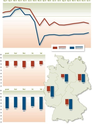 Die Solarhandwerker haben ihr Stimmungstief über den Jahreswechsel beibehalten: Laune und Perspektiven in der Branche sind ebenso unter dem Nullpunkt wie die Temperaturen. Das aktuelle Stimmungsbild dominieren sowohl bei den Elektrikern als auch bei ihren Kollegen aus dem Bereich Sanitär, Heizung, Klima (SHK) die Pessimisten, sie sind bei beiden Gruppen im Bundesdurchschnitt und in allen Regionen in der Mehrheit. Die schlechte Stimmung zeigt sich auch bei den Erwartungen der Befragten an die Geschäftsentwicklung der kommenden drei Monate (siehe Werte in der Deutschlandkarte). Die Solarhandwerker scheinen sich vor allem mit Zukunftssorgen herumzuschlagen, entsprechend pessimistisch ist der Ausblick. Die Konjunkturumfrage zeigt ein seit Monaten gewohntes Bild: Alle Befragten sehen bei der Frage nach ihren geschäftlichen Perspektiven schwarz. Die Branche ist förmlich erstarrt.