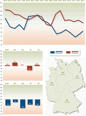 Trotz Frühlingssonne hellt sich die Laune der Solar-Installateure nicht auf. Die Elektriker sind der Konjunkturumfrage zufolge sowohl bundesweit als auch in allen vier Regionen pessimistisch. Bei ihren Kollegen aus dem Bereich Sanitär, Heizung, Klima haben die Optimisten deutlich an Boden verloren. Noch deutlicher wird die wenig erfreuliche Lage angesichts der Erwartungen an die Geschäftsentwicklung der kommenden drei Monate, die das ifo-Verfahren sichtbar macht. Die Elektriker sind bei ihrer Prognose durchweg weit vom positiven Bereich entfernt, besonders mau sind die Aussichten im Westen. Und ihre SHK-Kollegen sind jetzt sowohl bundesweit als auch im Westen, Süden und Osten wieder negativ eingestellt. Auch praktische Schwierigkeiten gibt es für die Installateure. Sie beklagen weiterhin, dass die Hersteller den Service reduzieren, und haben immer wieder das Problem, dass das Zubehör nicht passt. Dabei kann sich auf dem immer enger werdenden deutschen Markt eigentlich kein Anbieter solche Nachlässigkeiten leisten.