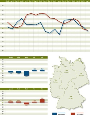 Die geteilte Stimmung der Branche spiegelt sich auch in den Erwartungen an die kommenden drei Monate wider, die das ifo-Verfahren sichtbar macht. Bei den Elektrikern sind die Prognosen sowohl im bundesweiten Durchschnitt als auch in allen Regionen deutlich verhaltener als vor einem Monat. Die SHK-Kollegen hingegen sind weit davon entfernt, ihre Erwartungen zurückzuschrauben. In allen Regionen verbesserten sich die Erwartungen an das kommende Quartal.