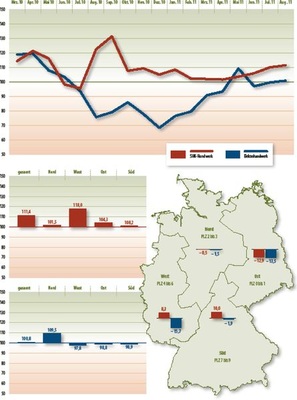 Eine vorsichtige Erholung in allen Regionen zeigt der monatliche Konjunkturindex. Bei den Elektrikern bestimmen bundesweit jetzt wieder die Optimisten das Stimmungsbild. Das liegt jedoch vor allem am sonnigen Gemüt der Befragten im Norden; die anderen Regionen sind eher pessimistisch. Positiver ist die Stimmung bei ihren Kollegen aus dem Bereich Sanitär, Heizung, Klima. Die Optimisten haben nicht nur bundesweit sowie im Norden, Westen und Süden ihre Mehrheit weiter ausgebaut, sondern auch im Osten für einen grundlegenden Stimmungswandel gesorgt.