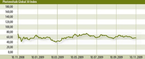 Trübes Herbstwetter und die Berichtssaison zum dritten Quartal 2009 – beides ist dem Photovoltaik Global 30 nicht gut bekommen. Am Stichtag 10. November lag sein Wert mit 56,15 Punkten gut zehn Prozent unter dem Niveau des Vormonats. In diesem Zeitraum konnten nur acht der 30 im Index vertretenen Unternehmen ihren Börsenwert verbessern.