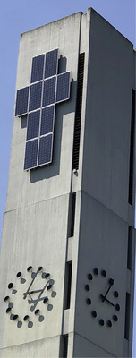 Solare Symbolik: Sonnenkreuz am Turm der Melanchthonkirche in Gaienhofen am Bodensee. www.gaienhofen.de