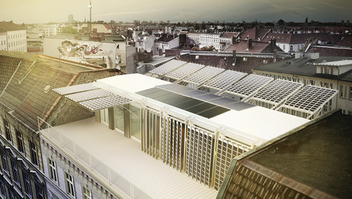Mit dem Konzept „Rooftop“ schaffte es ein Team der Technischen Universität und der Universität der Küste in Berlin ins Finale des Solar Decathlon Europe. Der findet in diesem Jahr in den Gärten von Versailles statt. Der diesjährige Bau- und Designwettbewerb zielt auf eine ressourcenschonende, energieeffiziente Stadtverdichtung. Die Lösungen sollen auf die spezifischen Gegebenheiten einer Stadt mit vielen Altbauten, hoher Bevölkerungsdichte und steigenden Mieten reagieren. Die Idee der Berliner besteht aus einer auf das Dach eines Altbaus gesetzten Etage. Die hochklappbare Solarfassade ist Stromgenerator, Schattenspender und isolierende Hülle zugleich. Der erzeugte Strom wird nicht zwischengespeichert, sondern mit den Mietern der darunterliegenden Stockwerke geteilt. http://www.teamrooftop.de