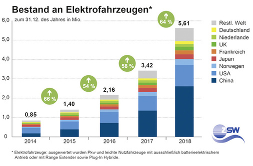Anfang 2019 ist der Bestand an Elektroautos weltweit auf 5,6 Millionen gestiegen. Das entspricht einem Plus von 64 Prozent im Vergleich zum Vorjahr. Das Wachstum hat sich damit zum zweiten Mal in Folge beschleunigt.