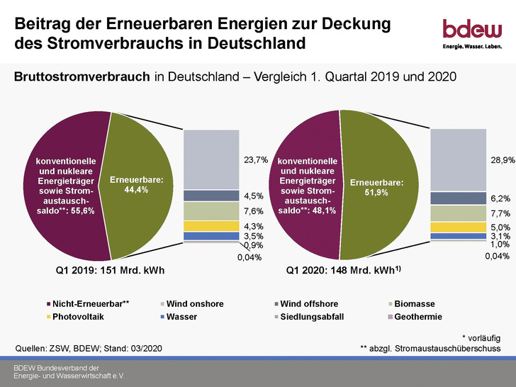 Im ersten Quartal 2020 haben die erneuerbaren Energien erstmals rund 52 Prozent des Bruttoinlandstromverbrauchs gedeckt. Das zeigen Berechnungen des Zentrums für Sonnenenergie- und Wasserstoff-Forschung Baden-Württemberg (ZSW) und des Bundesverbands der Energie- und Wasserwirtschaft (BDEW).