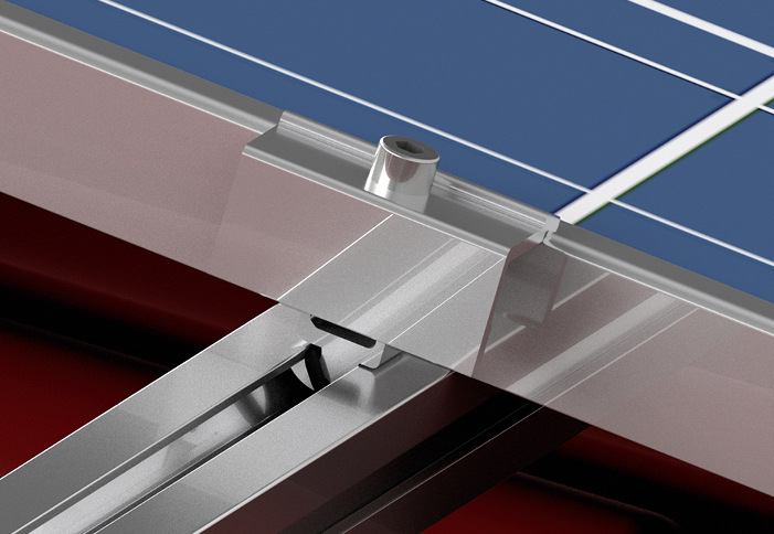 Aufgrund der standardisierten Mittel- und Endklemmen wird die Montage der Solaranlagen weiter vereinfacht, denn sie werden nur noch in das Profil geklickt. Ist das erfolgt, wird das Modul einfach eingeschoben. Ein Gummiring am Klemmstein dient als Montagehilfe, damit die Klemme bei der Montage nicht umfällt.
