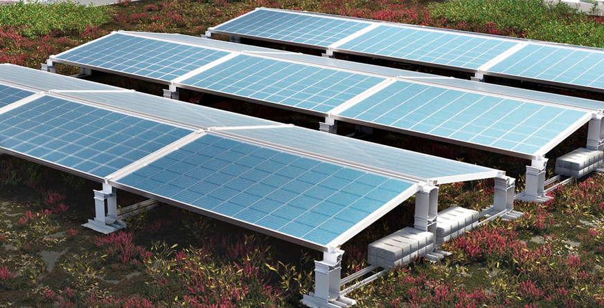 Das eigentliche Montagesystem für die Photovoltaikanlagen wird an Solarbasisplatten befestigt, die auf der Drainage- und Wasserspeicherschicht des Gründaches aufgelegt werden. Dabei hat der Planer mehrere Möglichkeiten. Denn Zinco hat unterschiedliche Solargrundrahmen, die an die Basisplatten angeschraubt werden und das Montagesystem für die Module bilden. So kann eine klassische Südaufständerung mit verschiedenen Winkeln realisiert werden. Es ist aber auch eine Ost-West-Aufständerung möglich – als Satteldach- wie auch als Schmetterlingsdach-Variante.