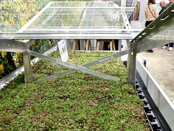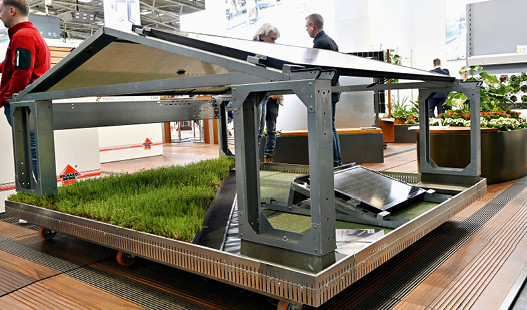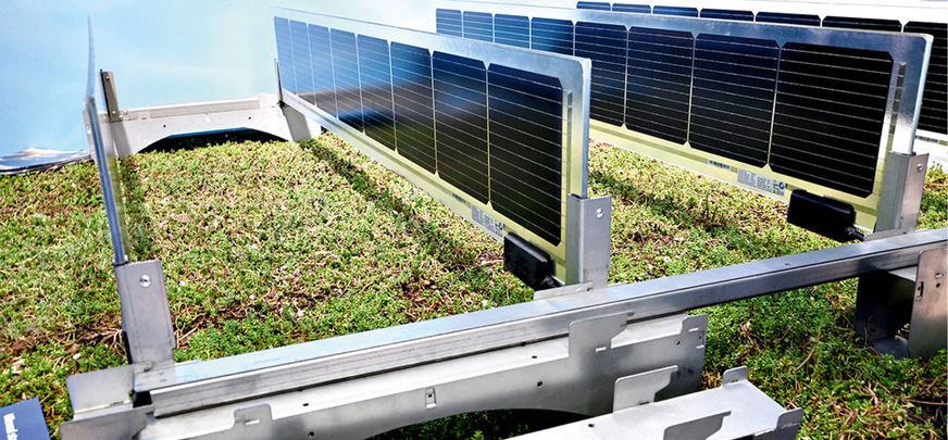Der norwegische Hersteller Over Easy Solar hat auf der Messe Bau seine Lösung für die vertikale Aufständerung von Solarmodulen auf Gründächern präsentiert. Ihr Vorteil ist, dass sie sich schnell montieren lässt und die Verschattung der Dachbegrünung im Vergleich zu den flach aufgeständerten Systemen minimiert wurde.