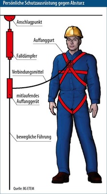 keiten sehr viel praktischer als eine Rückenöse. „Wenn man von einer hinteren Fangöse gehalten wird, prallt man bei einem Sturz unter Umständen ungünstig aufs Dach oder gegen eine Mauer – und weil man die Hände kaum einsetzen kann, hängt man dann auch noch hilflos im Seil und kann nichts tun, um sich aus dieser Lage zu befreien.“ Ob das Teil einen Rückengurt hat oder gepolsterte Beinschlaufen, hängt von denVorlieben des Trägers ab. „Über eine gute Polsterung freut man sich natürlich vor allem bei einem Absturz“, sagt Knappik. „Wichtig ist, dass man seinen Gurt bequem findet und sich darin vernünftig bewegen kann. Das erhöht nicht nur die Akzeptanz, sondern erleichtert auch die Arbeit.“ Da jedoch viele Unternehmen beim Einkauf der Ausrüstung vor allem auf den Preis schauen, findet er es sinnvoll, selbst in eine eigene PSAgA zu investieren, die dann auch genau zum individuellen Nutzer passt und beispielsweise an den Seiten genügend Taschenringe und Halteösen hat. „Wenn sich der Akkuschrauber oder Befestigungsmaterial am Gurt unterbringen lassen, fällt mir nichts mehr vom Dach, außerdem habe ich die Hände frei für die Arbeit. Und Harakiri-Nummern, bei denen man mit einem Fuß auf der Leiter steht und mit dem anderen in der Regenrinne, die Schrauben links in derHand hat und den Akkuschrauber rechts und sich selbst und das Modul mit der Kraft seiner Gedanken festhalten muss, sind Geschichte.“ Stattdessen verhindern Halteschlingen und Seile einen Sturz (siehe Grafik). Direkt am Auffanggurt sitzt ein sogenanntes Verbindungsmittel, meistens ein Karabinerhaken und ein höchstens zwei Meter langes Seil. Und dessen Ende wird, wiederum mit einem Karabinerhaken, entweder direkt an einem Anschlagpunkt befestigt – was sicheres Arbeiten in einem kleinen Radius möglich macht – oder an einem sogenannten mitlaufenden Auffanggerät. Dieses Gerät läuft an einem horizontalen oder vertikalen Fixseil mit, so dass sich der Handwerker auf dem Dach nicht ständig neu anschlagen muss. Bei einem Sturz, also einer ruckhaften Bewegung, blockiert das Auffanggerät ähnlich wie ein Sicherheitsgurt im Auto und stoppt den Fall. Bei den Karabinerhaken lohnt sich übrigens ein Blick auf die Mechanik: Schnapper sind reine Materialkarabiner, für die Personensicherung muss der Verschluss nochmals gesichert sein. Trotzdem lassen sich auch solche Karabiner mit einer Hand bedienen, selbst mit Handschuh.