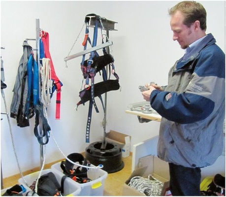 So viele Regeln? Da umwölken sich die Mienen der Seminarteilnehmer nicht nur während der Rauchpause. Aber als Matthias Knappik dann in seinen reichen Fundus greift und Auffanggurte und Seile, Karabinerhaken und Falldämpfer, Materialschlingen und mitlaufende Auffanggeräte, Helme und Anschlageinrichtungen auspackt, sind die Bedenken wieder vergessen. Obwohl es auch da wieder einige Regeln gibt: Zum einen muss jede PSAgA vom Hersteller mit einem sogenannten EG-Konformitätszeichen versehen sein, also dem Kürzel CE (für Communauté Européenne) plus Kennnummer der überwachenden Stelle. Und jeder lösbare Bestandteil eines Systems muss mit Typbezeichnung, Herstellungsjahr, Namen, Zeichen oder anderen Kennzeichen des Herstellers oder Lieferanten, Serien- oder Herstellnummer, Nummer der entsprechenden EN-Norm sowie einem Piktogramm gekennzeichnet sein, das zeigt, dass die Benutzer die vom Hersteller gelieferten Informationen lesen müssen. Zum anderen müssen für alle verwendeten Komponenten die Bedienungsanleitungen aufbewahrt werden, in denen wesentliche Aspekte wie das Alter der Teile und derenjährliche Überprüfung vermerkt werden. Knappik: „Die Bedienungsanleitung ist wie ein Kfz-Schein.“ Er rät, das Original im Büro abzuheften und eine – am besten laminierte – Kopie ins Auto oder direkt zur Ausrüstung zu legen. „Aber nicht alles in eine Kiste, in der die dreckigen Teile dann vor sich hin gammeln.“ Schließlich müssen die Komponenten – auch das ist Vorschrift – in trockenen, nicht zu warmen Räumen sauber und frei hängend aufbewahrt werden, geschützt vor direktem Licht und UV-Strahlung sowie aggressiven Stoffen wie Laugen oder Ölen. Knappiks Tipp zur Schonung der Komponenten auf meist weder sauberen noch trockenen Baustellen: eine Decke oder ein Stück Teppich mitnehmen, worauf die Ausrüstung ausgepackt, sortiert und angelegt werden kann.