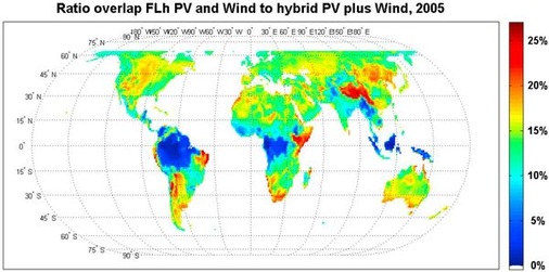 Das bedeutet, man muss bei einem Hybridkraftwerk mit doppelter Leistung nicht unbedingt das Netz verdoppeln. Weltweit simuliert, übersteigen nur zwei bis drei Prozent der Energie aus Windkraft und Photovoltaik die Netzkapazität. „An besonderen Standorten können dies sieben bis neun Prozent sein“, meint Breyer. „Wind und Photovoltaik ergänzen sich sehr gut. Es gibt keinen Grund, nicht zu kooperieren.“ Bei den Simulationen wurde deutlich, dass die Solarkraftwerke nicht so stark wie die Windrotoren fluktuieren. Solarstrom wird zwischen Sonnenaufgang und Sonnenuntergang erzeugt, also innerhalb von zwölf Stunden. Windkraft wird auch nachts ins Netz eingespeist, wenn die Sonnengeneratoren auf null stehen.