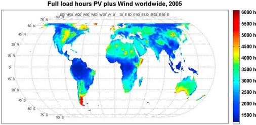 Die Forscher haben Einstrahlungsdaten und Windgeschwindigkeiten der Nasa und des Deutschen Zentrums für Luft- und Raumfahrt (DLR) in Köln benutzt, um das Hybridmodell für alle Regionen der Erde zu rechnen, die zwischen 65 Grad südlicher und 65 Grad nördlicher Breite liegen. Dazu legten sie ein Raster von jeweils einem Breitengrad und einem Längengrad Kantenlänge über den Globus und berechneten die Erträge in 20 Jahren auf die Stunde genau. Referenzjahr war 2005.