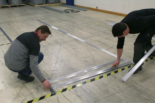 In der Startposition stehen die beiden Monteure Zbigniew Franczak und David Millsap bereit und warten auf das Startsignal. Und los geht es. Schnell verlegen Franczak und Millsap die ersten beiden Montageschienen. Bei der Orientierung helfen ihnen die Hilfslinien auf dem Hallenboden, die so auf einem Dach natürlich nicht zu finden sind. Kurz danach haben die beiden Monteure die ersten Querschienen ausgelegt. Rasch platziert Millsap die nächsten Schienen, während Franczak mit dem Verschrauben beginnt. Während Franczak dem Grundgestell die nötige Stabilität gibt, setzt Millsap bereits die Montagedreiecke, auf denen die Module später in Ost-West-Richtung geklemmt werden. Als die Stoppuhr 05:16 zeigt, ist die Grundfläche ausgelegt und die ersten beiden Montagedreiecke stehen.In den Hallen von REM finden sich keine automatisierten Fertigungsstraßen, die am Schluss die verpackten Montagesysteme auswerfen. Die Komponenten werden an verschiedenen Maschinen mit relativ viel Handarbeit produziert. Fertige und halbfertige Teile lagern in verschiedenen Metallcontainern und harren der Weiterverarbeitung.