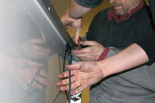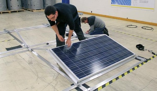 Die Stoppuhr zeigt 27 Minuten und 46 Sekunden, als das letzte, das achte Modul auf dem Gestell liegt. Nun geht es darum, die restlichen Module festzuklemmen und die verbleibenden Anschlusskabel zu verlegen.